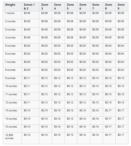 Price is less than a one-ounce letter. Maximum size is 108 in combined length and girth distance around the thickest part. First-Class Mail Mail in 15 Business Days.